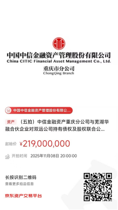 中國(guó)中信金融資產(chǎn)管理股份有限公司重慶市分公司(簡(jiǎn)稱(chēng):中信金融資產(chǎn)重慶分公司)與蕪湖華融資本創(chuàng)榮投資中心(有限合伙)(簡(jiǎn)稱(chēng):蕪湖華融合伙企業(yè))對(duì)重慶雙遠(yuǎn)實(shí)業(yè)(集團(tuán))有限公司(簡(jiǎn)稱(chēng):雙遠(yuǎn)公司)持有債權(quán)及股權(quán),將于2025年11月8日20時(shí)至2025年11月9日20時(shí)在京東拍賣(mài)網(wǎng)通過(guò)公開(kāi)競(jìng)價(jià)方式進(jìn)行處置,拍賣(mài)鏈接如下圖所示,現(xiàn)予以公告。